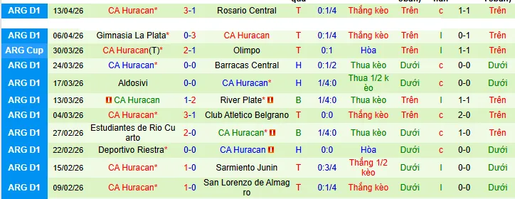 + Huracán đã vượt qua mức chấp +0.25 trong 8/10 trận gần đây nhất của họ.