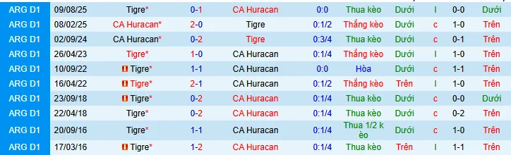 + Tigre đã không vượt qua mức chấp -0.25 trong 2 trận liên tiếp gặp Huracán.