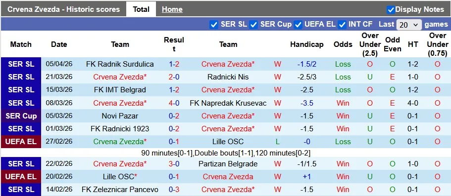 Thống kê phong độ 10 trận đấu gần nhất của Crvena Zvezda