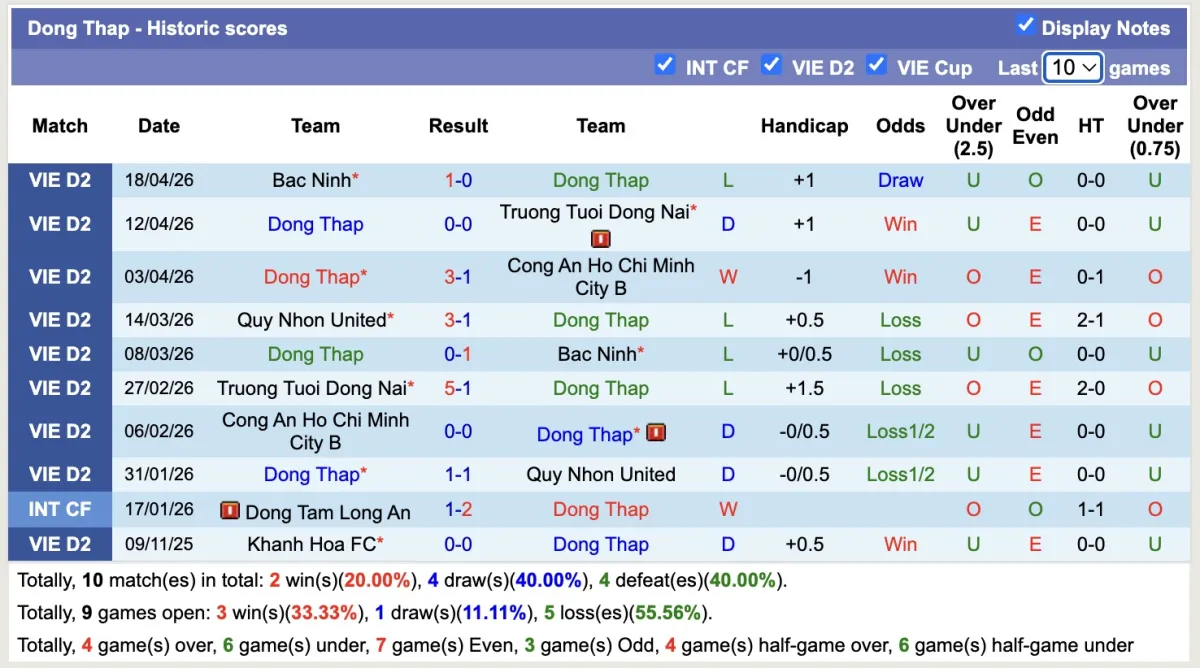 – Thống kê phong độ 10 trận đấu gần nhất của Đồng Tháp