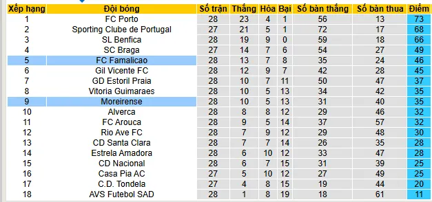 Bảng xếp hạng giải VĐQG Bồ Đào Nha 2025/26