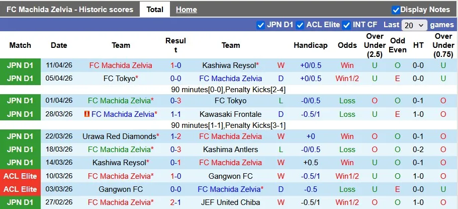 Thống kê phong độ 10 trận gần nhất của Machida Zelvia
