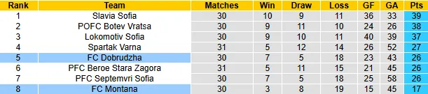 Ngược lại, Dobrudzha (vị trí thứ 5 play-off) hiện tại đang có 26 điểm và vẫn còn nhiều cơ hội để tự quyết trong cuộc chiến trụ hạng. Khoảng cách 9 điểm với Montana mang lại lợi thế rất lớn giúp Dobrudzha có tâm lý thi đấu thoải mái hơn.