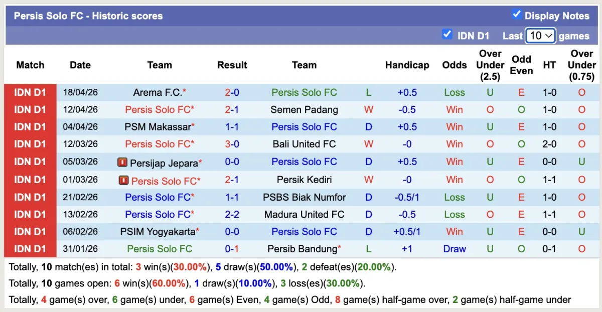 – Thống kê phong độ 10 trận đấu gần nhất của Persis Solo