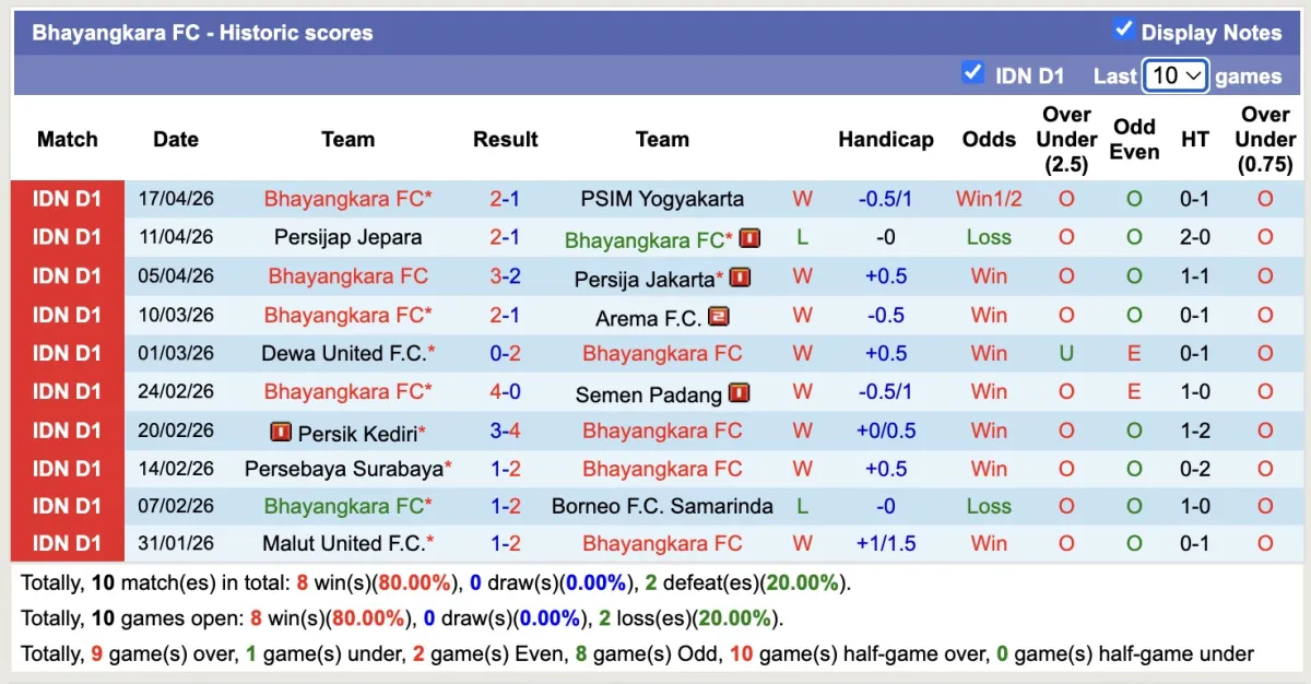 – Thống kê phong độ 10 trận đấu gần nhất của Bhayangkara