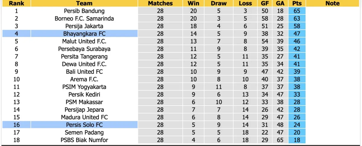 Cụ thể, sau 28 vòng đấu tại giải VĐQG Indonesia, Persis Solo mới chỉ có được 5 chiến thắng và đã thua đến 14 trận. Với 24 điểm hiện có, đội chủ nhà đang nằm trong khu vực xuống hạng và chỉ cách nhóm an toàn 2 điểm.