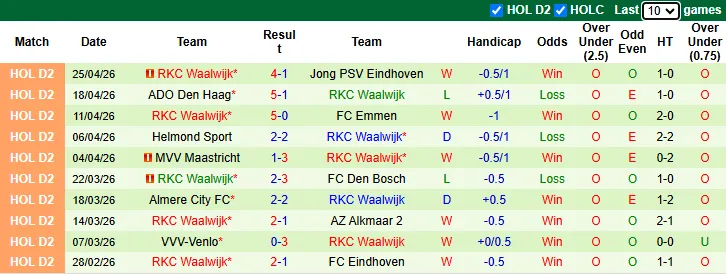 Thống kê phong độ 10 trận gần nhất của RKC Waalwijk