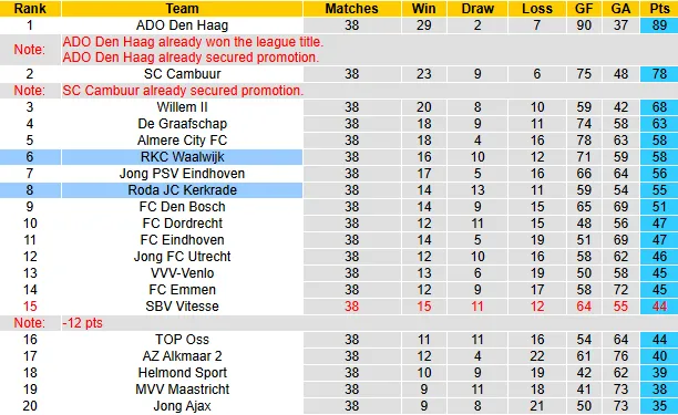 Ở phía bên kia, RKC Waalwijk bước vào vòng play-off với vị trí thứ 6 trên bảng xếp hạng, sở hữu 58 điểm sau 38 trận. Đội bóng này vẫn có dàn cầu thủ dày dạn kinh nghiệm trong môi trường bóng đá chuyên nghiệp. Phong độ của họ thời gian gần đây khá tốt với 3 chiến thắng trong 5 trận đấu cuối cùng (ghi được 15 bàn thắng).