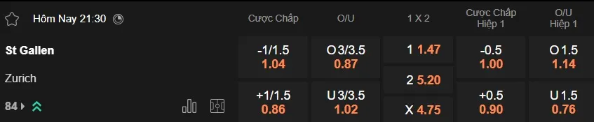 Trên sàn giao dịch châu Á, St. Gallen được đánh giá chấp 1 1/4 trái, đây là mức kèo cao nhất trong lịch sử đối đầu giữa hai đội, cho thấy sự tin tưởng lớn từ các nhà đầu tư đối với đội chủ nhà. Tuy nhiên, với thành tích thua kèo châu Á 3/4 trận sân nhà gần đây, St. Gallen có thể sẽ gặp khó khăn trước Zurich, đội đã thắng kèo trong 2 trận gần nhất khi được chấp kèo tương tự.