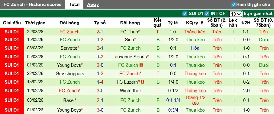 Thống kê phong độ 10 trận đấu gần nhất của Zurich