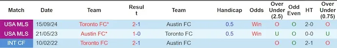Về mặt đối đầu, Toronto đang nắm lợi thế nhất định. Trong 3 lần gặp nhau gần nhất, Toronto đã thắng 2 trận. Đặc biệt, trên sân nhà, Toronto đã toàn thắng Austin trong cả 2 lần tiếp đón trước đó với cùng tỷ số 2-1. Xu hướng này cho thấy BMO Field thường mang lại lợi thế rõ rệt cho đội chủ nhà.