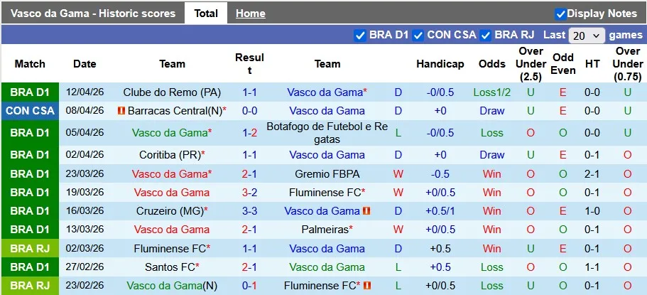 Trong 3/4 trận gần đây của Vasco da Gama, số bàn thắng ghi được không vượt quá 2. Cả hai đội cũng không ghi được bàn nào ở lượt trận mở màn. Khả năng có nhiều bàn thắng trong trận đấu này là không cao.