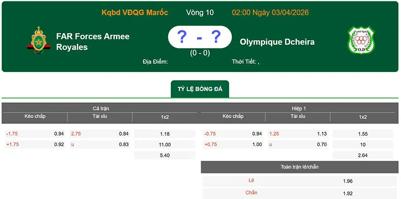 SOI KÈO, DỰ ĐOÁN TỶ LỆ BÓNG ĐÁ FAR RABAT VS OLYMPIQUE DCHEIRA