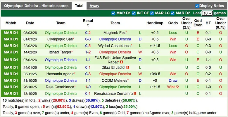 – Thống kê phong độ 10 trận đấu gần nhất của Olympique Dcheira