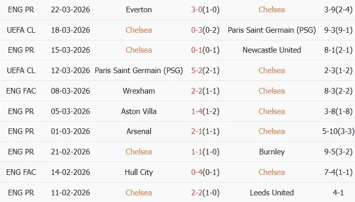 Thống kê phong độ 10 trận đấu gần nhất của Chelsea