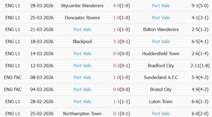 Thống kê phong độ 10 trận đấu gần nhất của Port Vale