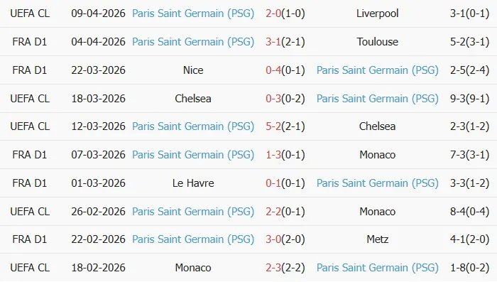 Thống kê phong độ 10 trận đấu gần nhất của Paris Saint-Germain