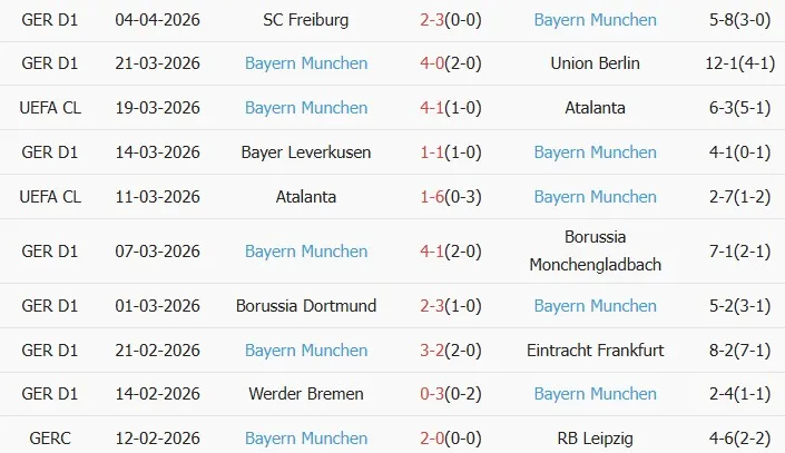 Thống kê phong độ 10 trận đấu gần nhất của Bayern Munich