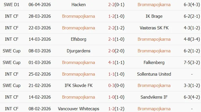 Thống kê phong độ 10 trận đấu gần nhất của Brommapojkarna
