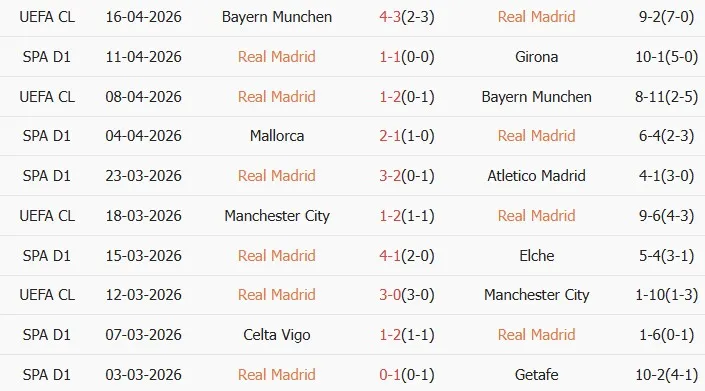 Thống kê phong độ 10 trận đấu gần nhất của Real Madrid