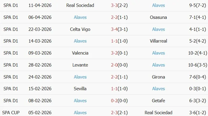 Thống kê phong độ 10 trận đấu gần nhất của Alaves