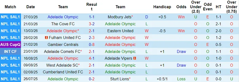 – Thống kê kết quả 10 trận gần nhất của Adelaide Olympic