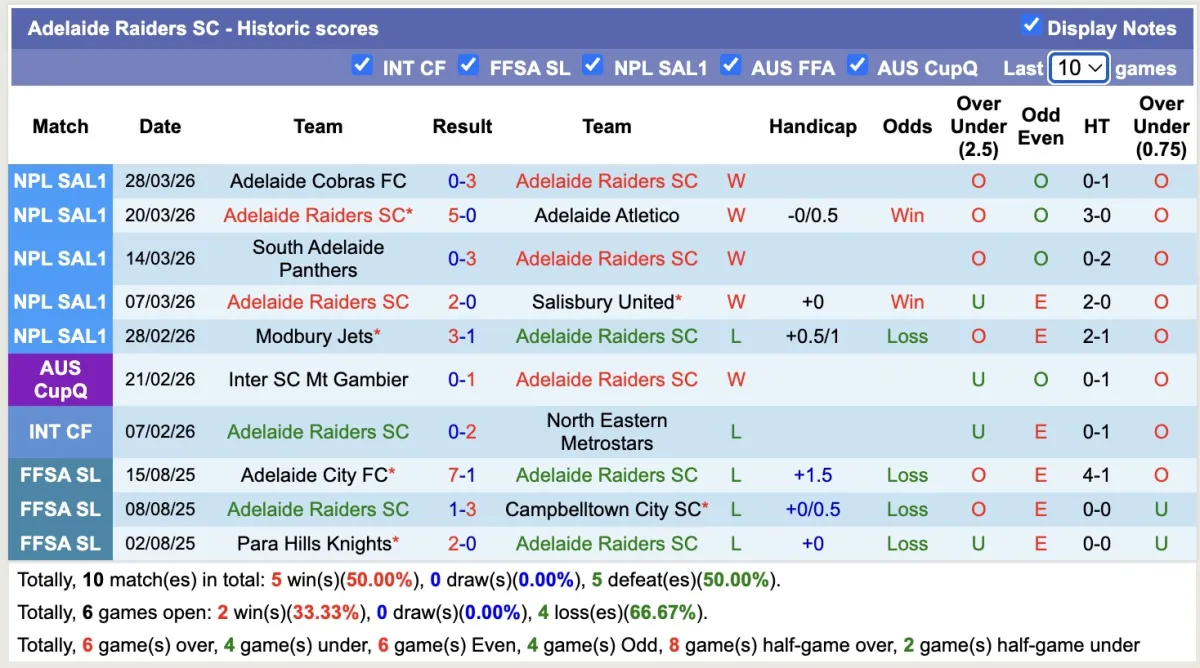 -Thống kê phong độ 10 trận đấu gần nhất của Adelaide Raiders SC