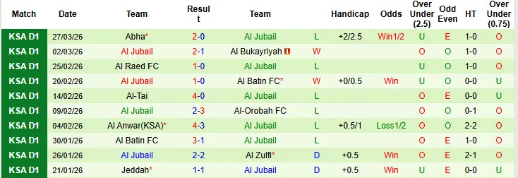 Thống kê phong độ 10 trận đấu gần nhất của Al Jubail