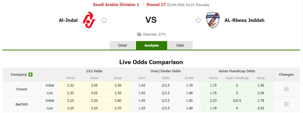 Nhận định soi kèo Al Jandal vs Jeddah, 20h15 ngày 2/4 tại hạng Nhất Saudi Arabia. Phân tích tỷ lệ kèo, dự đoán kết quả Al Jandal đấu với Jeddah từ tỷ lệ châu Âu, châu Á qua các chuyên gia hàng đầu.