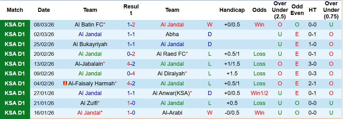 Thống kê phong độ 10 trận đấu gần nhất của Al Jandal