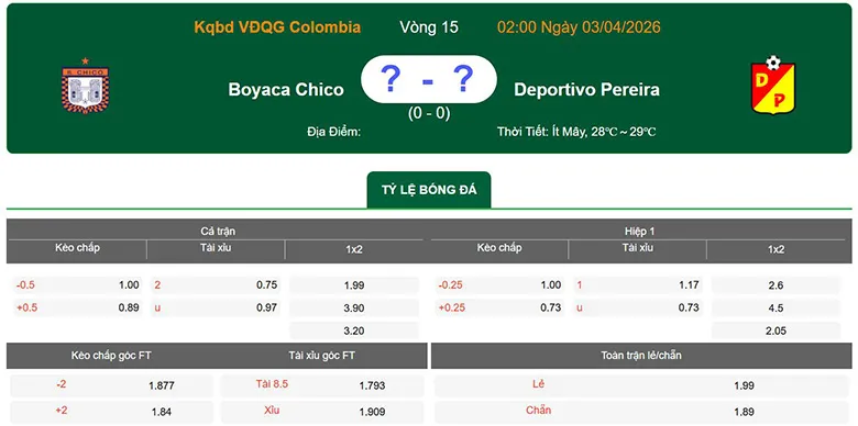 SOI KÈO, DỰ ĐOÁN TỶ LỆ BÓNG ĐÁ BOYACA CHICO VS DEPORTIVO PEREIRA