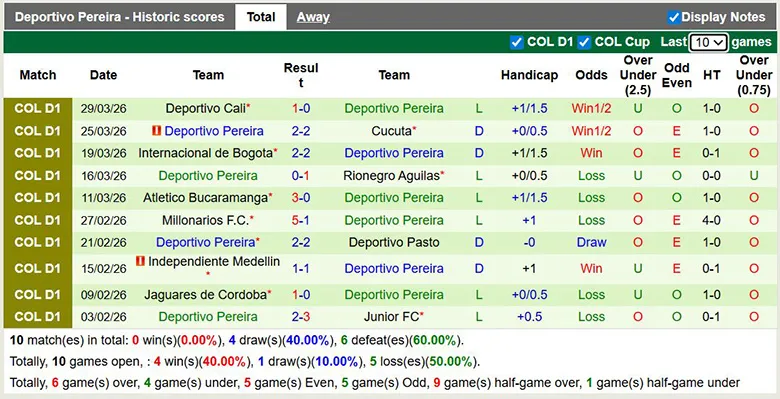 – Thống kê phong độ 10 trận đấu gần nhất của Deportivo Pereira