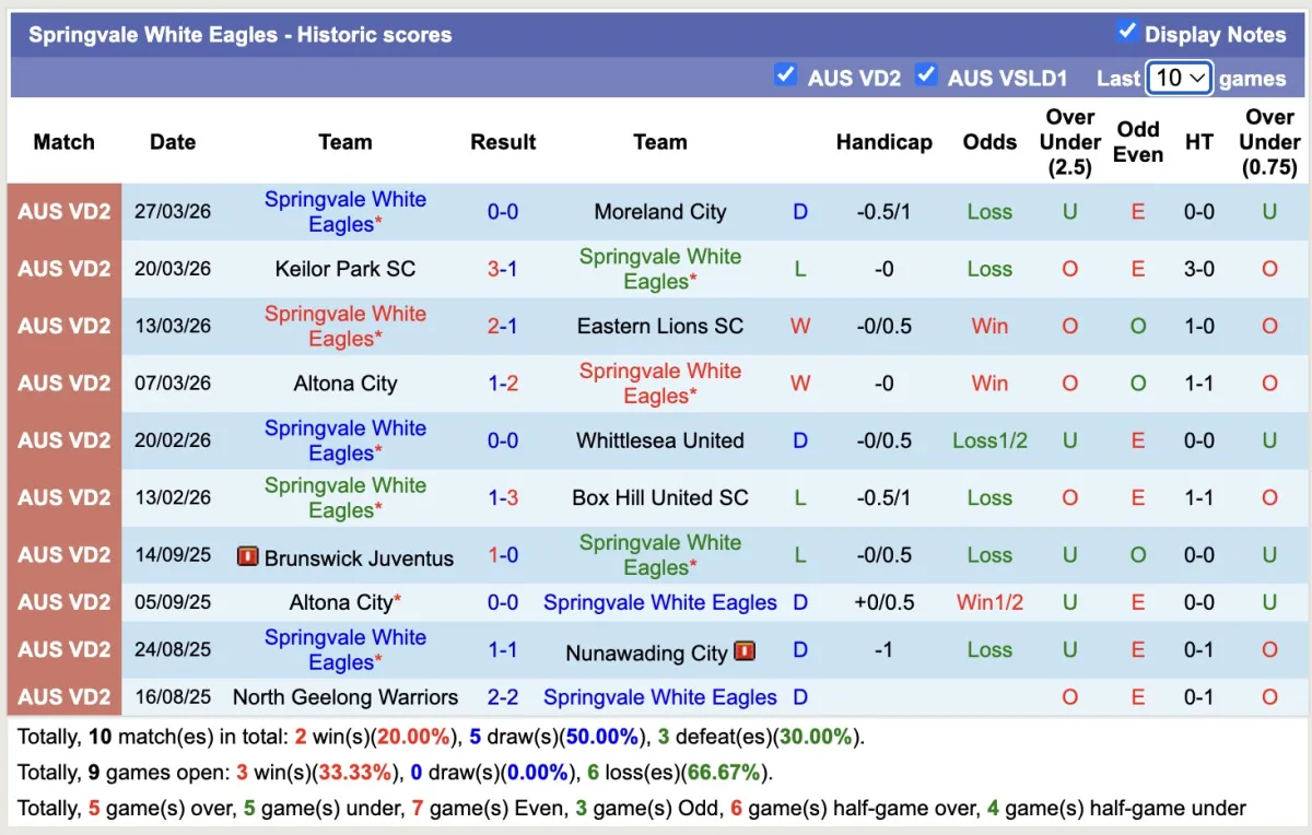-Thống kê phong độ 10 trận đấu gần nhất của Springvale White Eagles