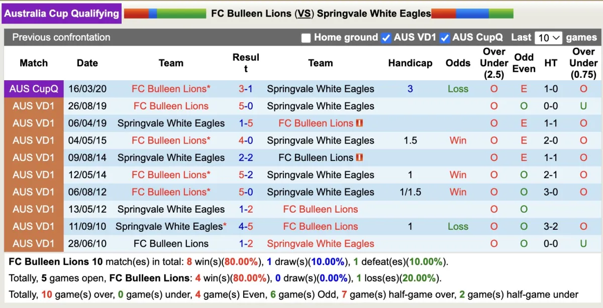 Không có gì bất ngờ khi Bulleen Lions được đánh giá cao hơn trận này, 3/4 trận gần nhất đội bóng này đều thắng kèo và 10/13 trận liên tiếp gần đây Springvale White Eagles đều không thể vượt ải Handicap, có lẽ chủ nhà xứng đáng được chọn.