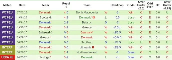 Đan Mạch thậm chí còn có thành tích tổng thể tốt hơn với 6 chiến thắng, 3 trận hòa và chỉ 1 thất bại trong 10 trận gần nhất. Tuy vậy, khi rời sân nhà họ không phải lúc nào cũng duy trì được sự chắc chắn. 4 chuyến làm khách gần đây mang về 2 thắng, 1 hòa và 1 thua, và trận thua 2-4 trước Scotland cho thấy hàng thủ có thể bị khai thác khi thế trận trở nên căng thẳng.