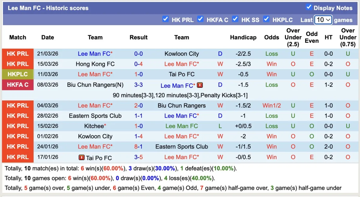 -Thống kê phong độ 10 trận đấu gần nhất của Lee Man