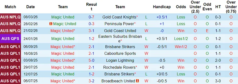 Trước khi đấu AC Carina, Magic United thua toàn bộ 2 trận – lần lượt trước Peninsula Power (0-3, sân nhà) và Gold Coast Knights (0-7, sân nhà). Trong khi đó, AC Carina thắng toàn bộ 5 trận gần đây và đều ghi từ 2 bàn trở lên.