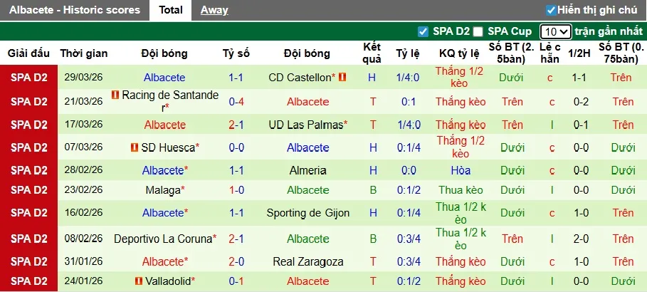 Thống kê phong độ 10 trận đấu gần nhất của Albacete