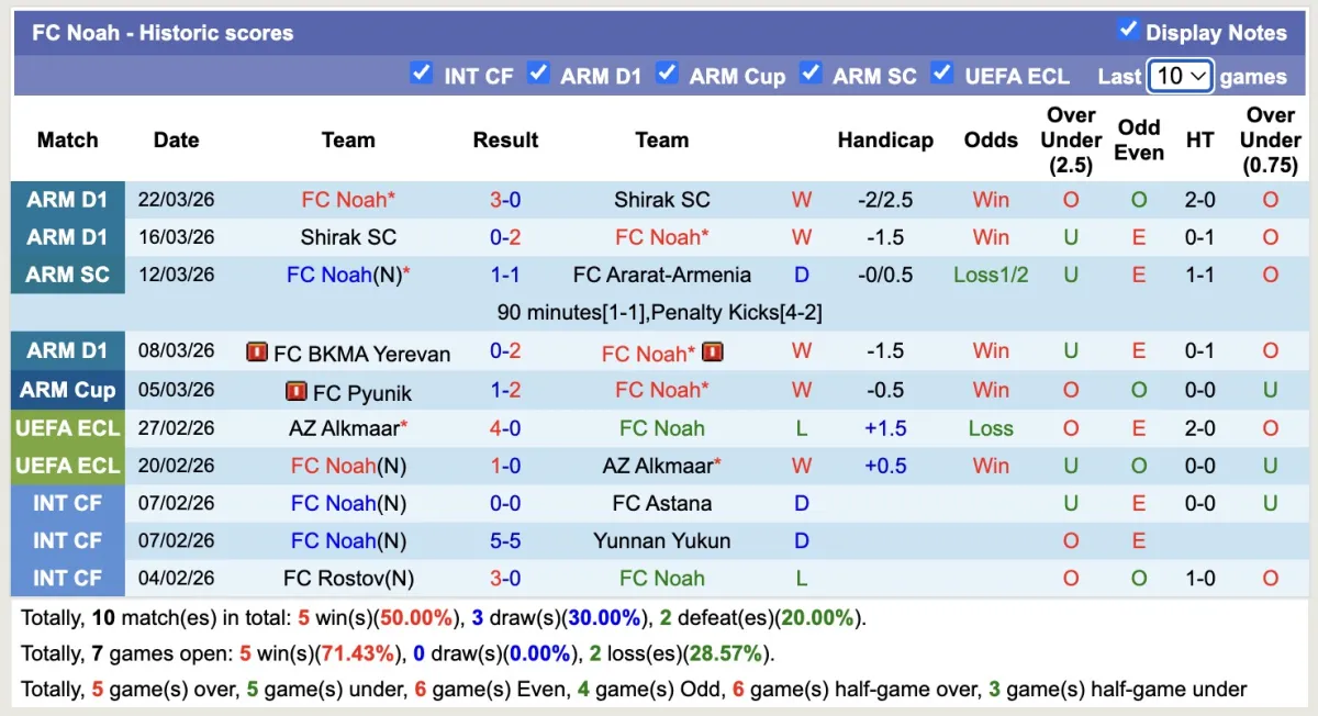 -Thống kê phong độ 10 trận đấu gần nhất của Noah