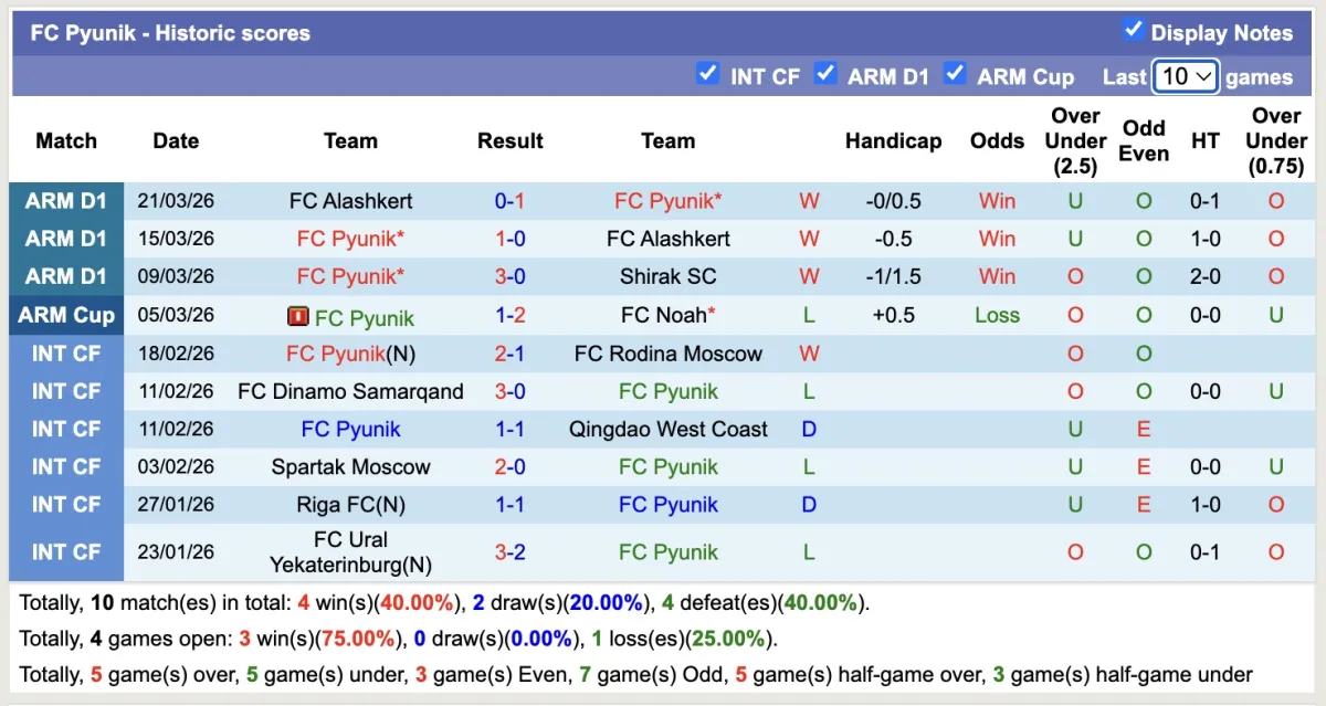 -Thống kê phong độ 10 trận đấu gần nhất của Pyunik