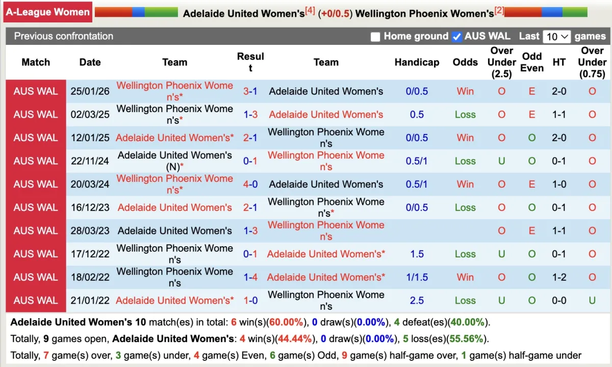Thống kê phong độ, lịch sử đối đầu của Nữ Adelaide United với Nữ Wellington Phoenix