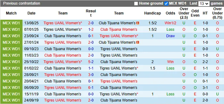 Lịch sử đối đầu đang nghiêng hoàn toàn về phía đội khách. Trong 10 lần chạm trán gần nhất, Nữ Tigres UANL giành tới 6 chiến thắng, hòa 2 và chỉ để thua 2 trận. Ở trận lượt đi (Apertura 2025), Tigres đã nhẹ nhàng vượt qua Tijuana với tỷ số 2-0. Việc phải thi đấu trên sân khách không phải là rào cản quá lớn đối với bản lĩnh của các cô gái vùng Monterrey.