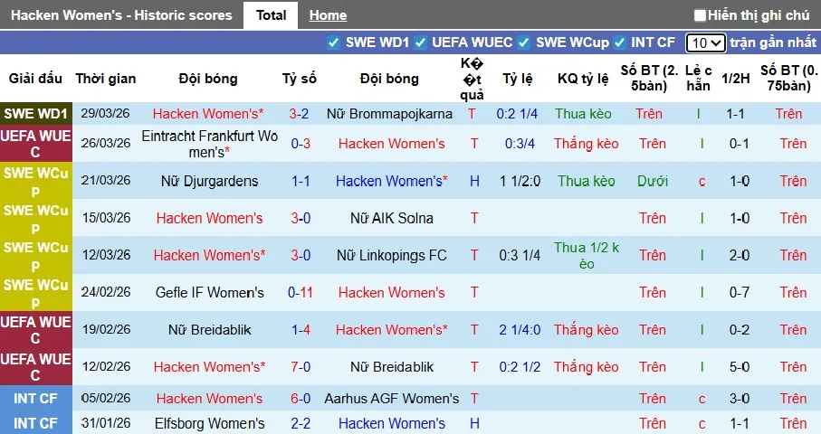 Thống kê phong độ 10 trận đấu gần nhất của Nữ Hacken