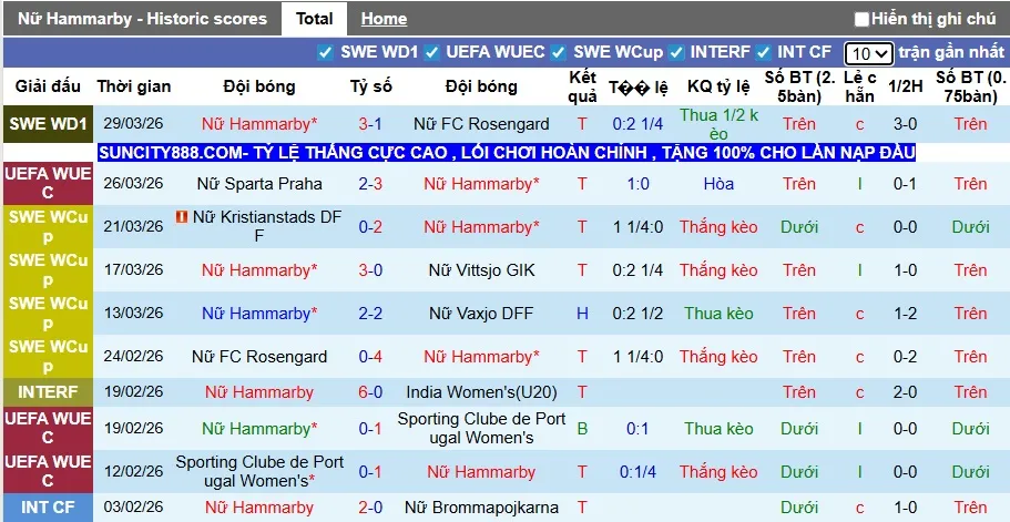 Sàn giao dịch châu Á ghi nhận mức kèo Nữ Hammarby chấp 1 1/4 trái, tỷ lệ mà đội bóng Thụy Điển rất có duyên thời gian gần đây. Thống kê cho thấy, 2 trận gần nhất xuất hiện họ đều giành chiến thắng cách biệt mà không để thủng lưới bàn nào.