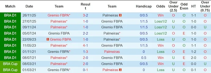 Lịch sử đối đầu cũng nghiêng khá mạnh về Palmeiras. Trong 10 lần gặp nhau gần đây, Palmeiras thắng 7 trận. Đáng chú ý hơn, 5 lần tiếp đón Gremio gần nhất trên sân nhà đều kết thúc với chiến thắng dành cho đội bóng áo xanh. Chuỗi kết quả đó tạo ra một lợi thế tâm lý rất lớn trước cuộc tái đấu lần này.