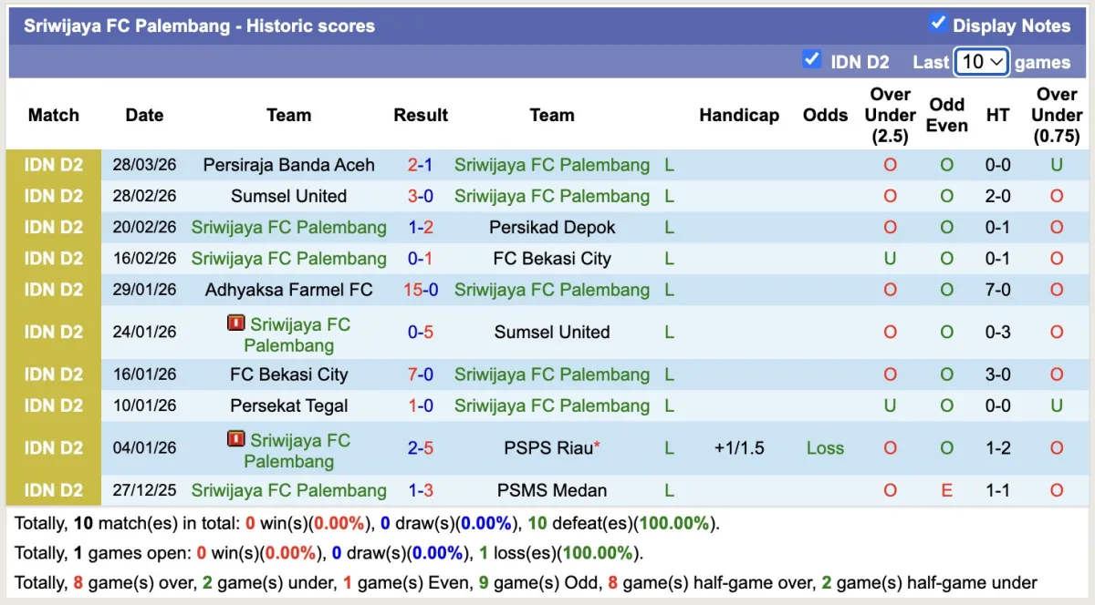 -Thống kê phong độ 10 trận đấu gần nhất của Sriwijaya