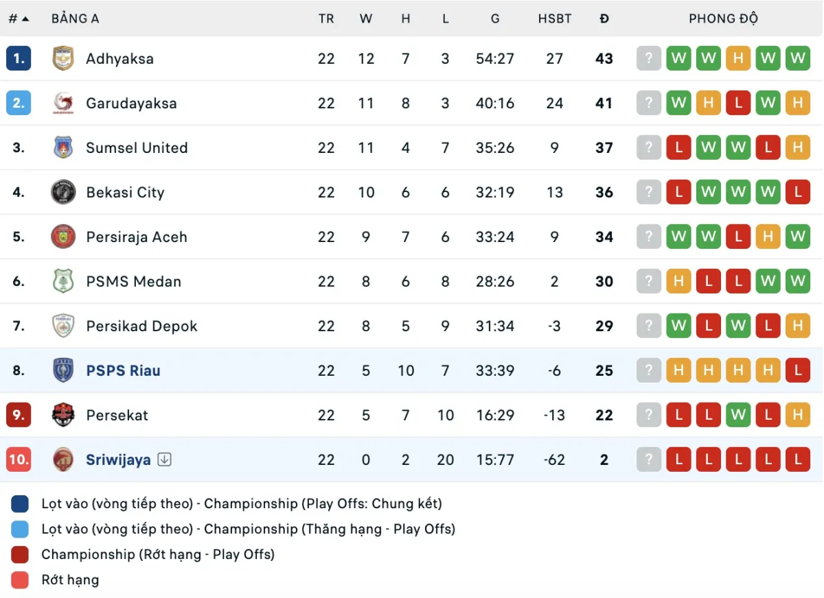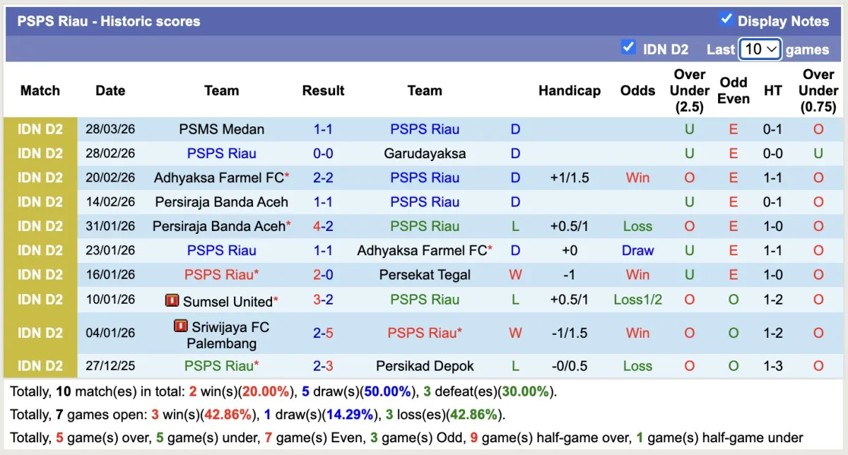 -Thống kê phong độ 10 trận đấu gần nhất của PSPS Riau