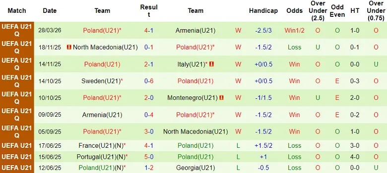 – Thống kê kết quả 10 trận gần nhất của U21 Ba Lan