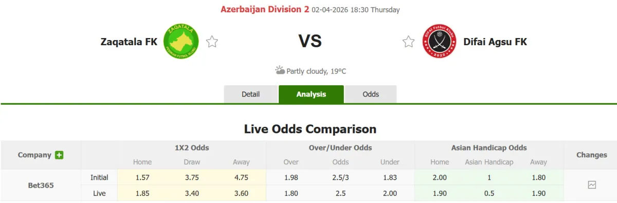 Nhận định soi kèo Zaqatala FK vs Difai Agsu, 18h30 ngày 2/4 tại hạng Nhất Azerbaijan. Phân tích tỷ lệ kèo, dự đoán kết quả Zaqatala FK đấu với Difai Agsu từ tỷ lệ châu Âu, châu Á qua các chuyên gia hàng đầu.