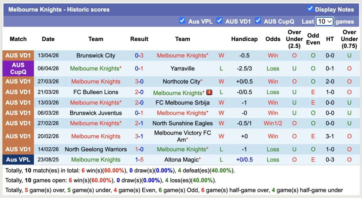 – Thống kê phong độ 10 trận gần nhất của Melbourne Knights.